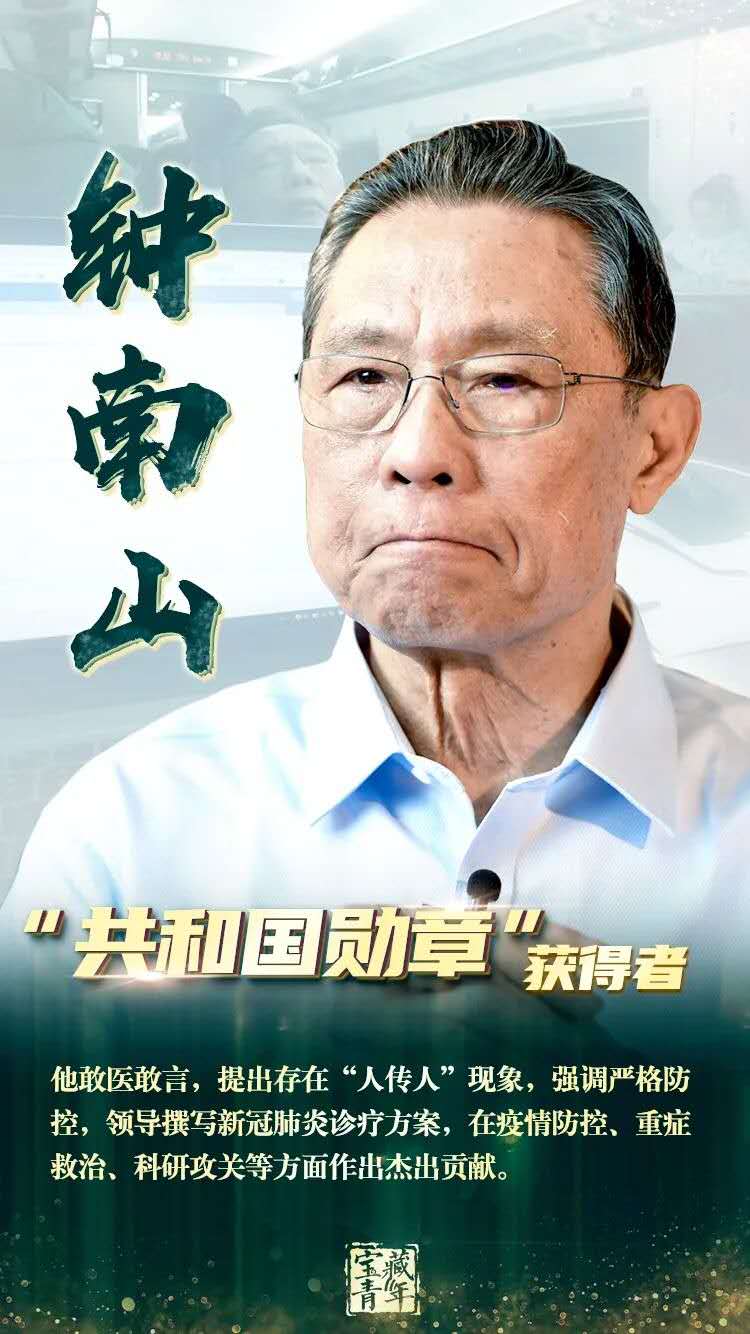 国家主席习近平11日签署主席令,根据十三届全国人大常委会第二十一次会议11日下午表决通过的全国人大常委会关于授予在抗击新冠肺炎疫情斗争中作出杰出贡献的人士国家勋章和国家荣誉称号的决定,授予钟南山“共和国勋章”,授予张伯礼、张定宇、陈薇(女)“人民英雄”国家荣誉称号。