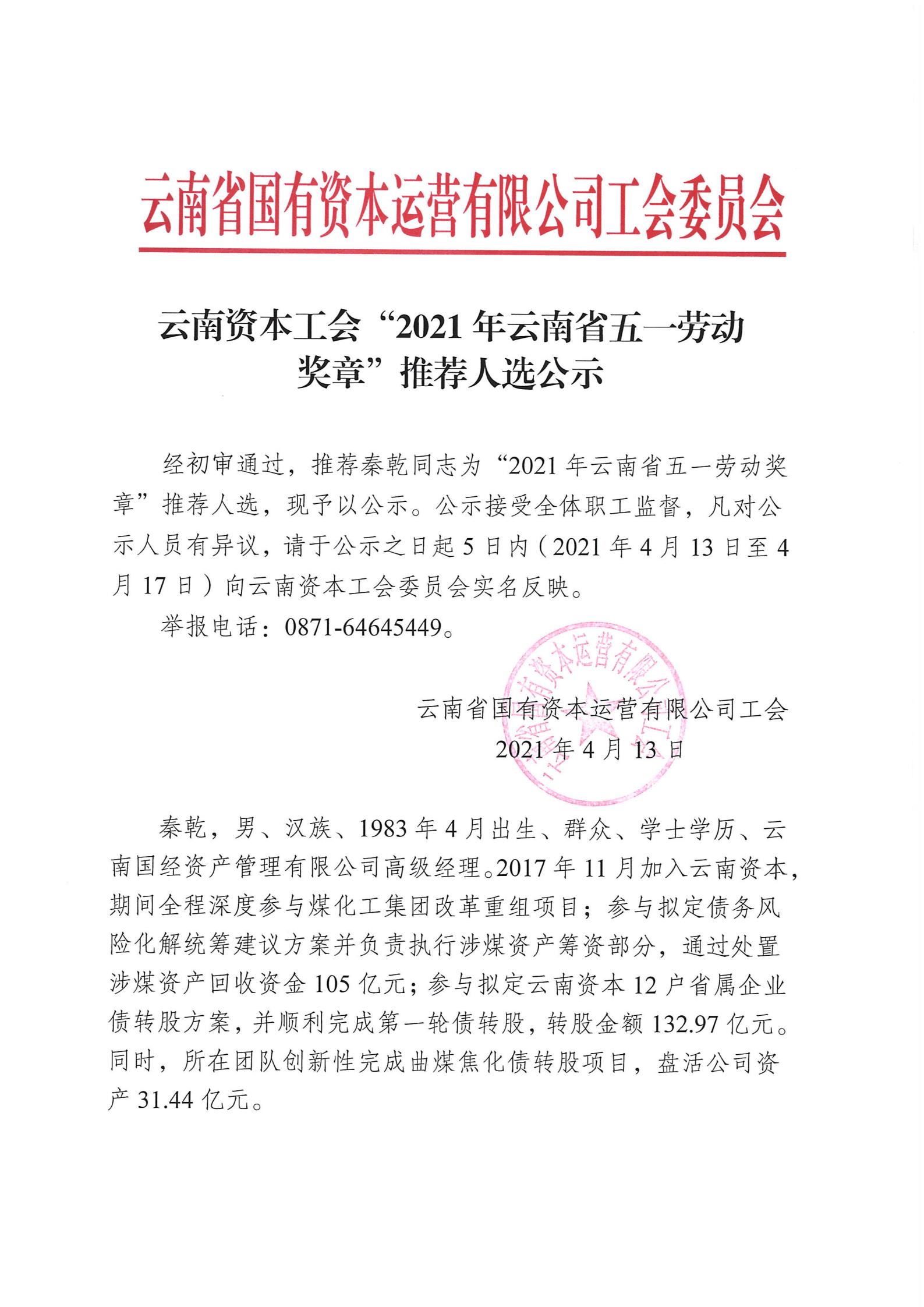 云南资本工会“2021年云南省五一劳动奖章”推荐人选公示